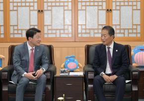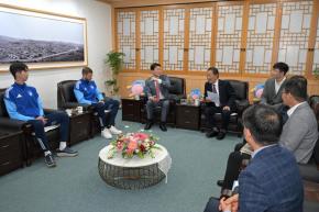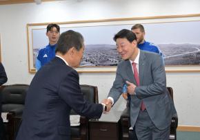 - 사진설명 22일 (재)고래문화재단 서동욱 이사장(남구청장)과 울산HD FC 강명원 대표이사(왼쪽)가 남구청 3층 소회의실에서 ‘스포츠·문화 활성화를 위한 업무교류 협약’을 체결하고 있다.