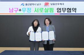 - 사진설명 12일 울산 남구와 남울산우체국(국장 박명숙)은 남구청 3층 소회의실에서 고립·위기가구 안부살핌 협력을 통한 고독사 예방을 위해 ‘남구+우정 서로살핌’ 업무협약을 체결했다.