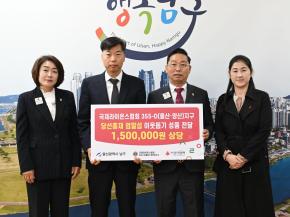 - 사진설명 16일 국제라이온스협회 355-D(울산·양산) 지구 엄말섭 총재(오른쪽 다섯 번째)가 남구청 부구청장실에서 관내 저소득 세대를 위한 이웃돕기 성품을 사회복지공동모금회에 지정 기탁하고 이채권 남구부구청장과 기념촬영을 하고 있다.