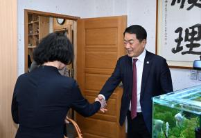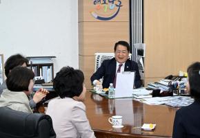 - 사진설명 2일 남구 여성단체협의회 송병길 회장(왼쪽 두 번째)이 남구청을 내방하여 구청장실에서 서동욱 남구청장과 환담을 나누고 기념촬영을 하고 있다.